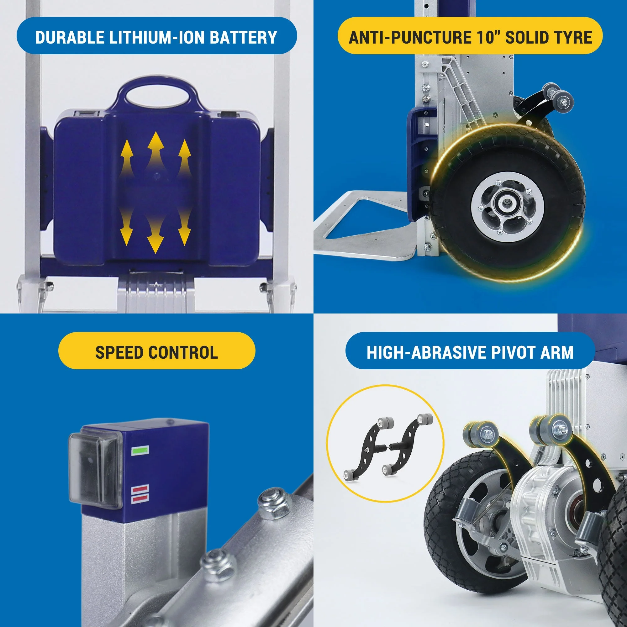 XSTO ZW7210GC, alüminyum alaşımlı gövdesi, katlanabilir ayak plakası ve kaymaz lastikleriyle hafif ama sağlam bir motorlu merdiven tırmanma el arabasıdır. Hızlı tak‑çıkar lityum pil tasarımıyla uzun pil ömrü sunar.